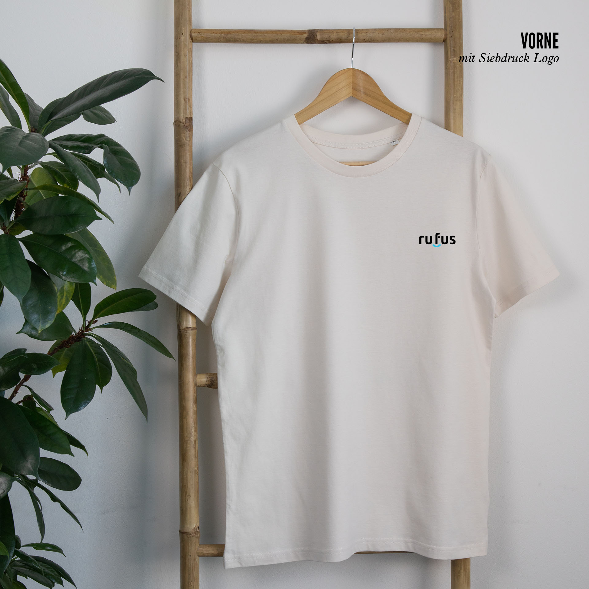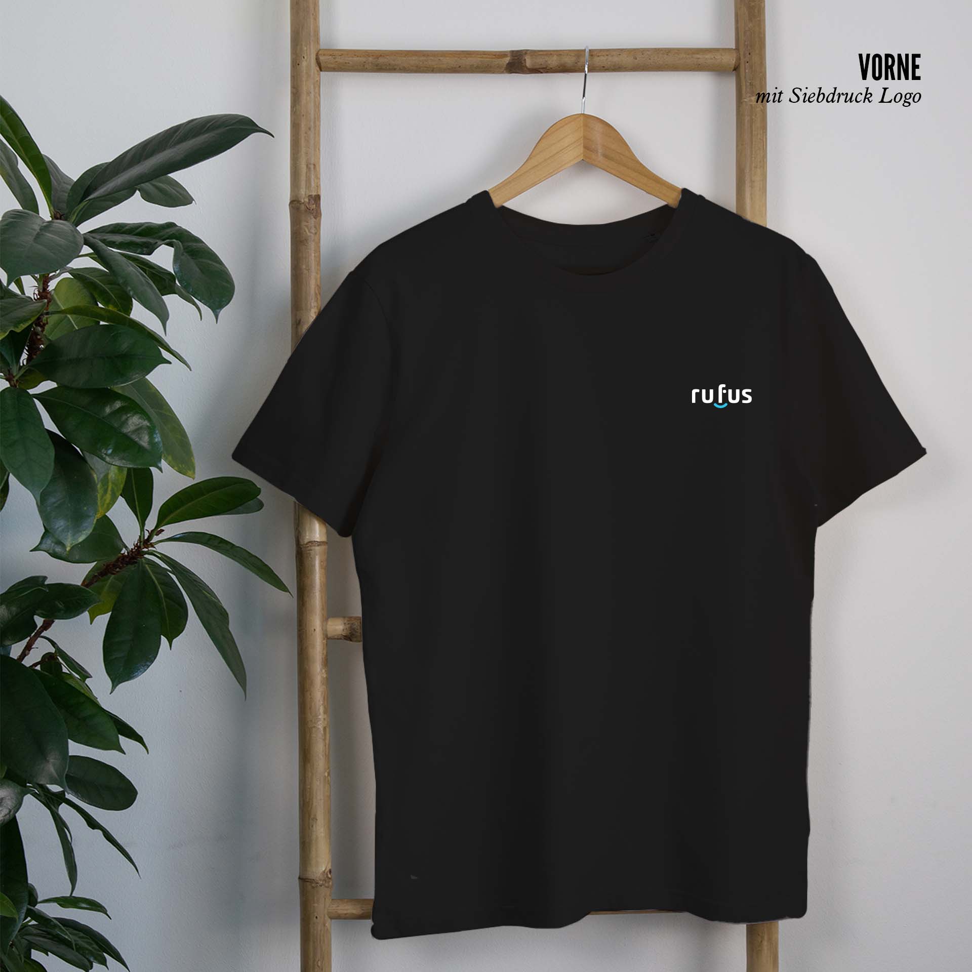 Das rufus Logo ist vorne links T-Shirt platziert.